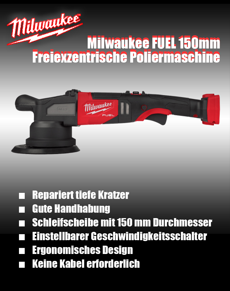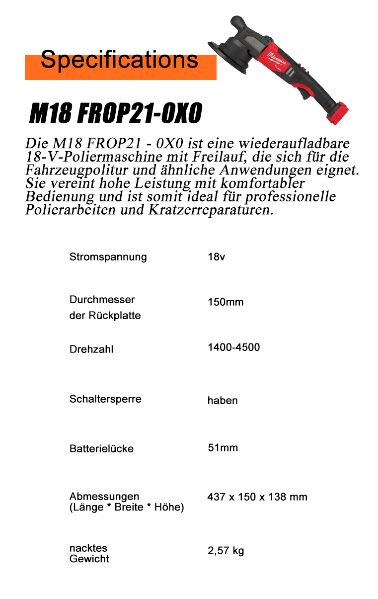 Sonderangebote sind da!Die M18 FROP21-0X0 Poliermaschine für große Exzentrizität ist leicht und tragbar, mit verschiedenen Schleifscheiben kompatibel und zu diesem reduzierten Preis ein unschlagbares Angebot!Die M18 FROP21 - 0X0 ist eine wiederaufladbare 18-V-Poliermaschine mit Freilauf, die sich für die Fahrzeugpolitur und ähnliche Anwendungen eignet. Sie vereint hohe Leistung mit komfortabler Bedienung und ist somit ideal für professionelle Polierarbeiten und Kratzerreparaturen.