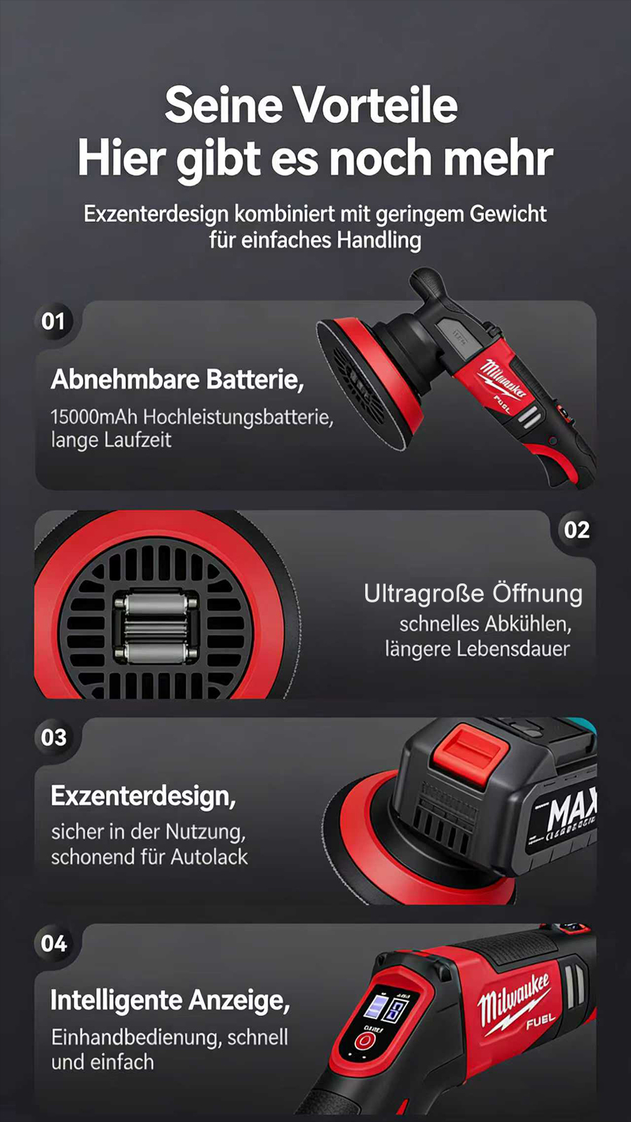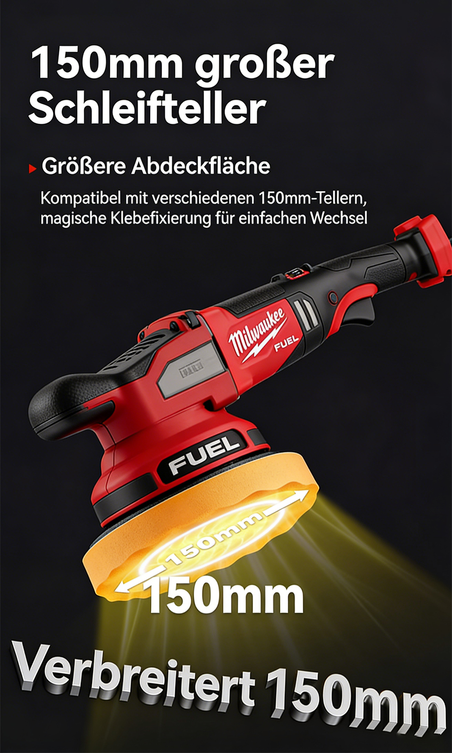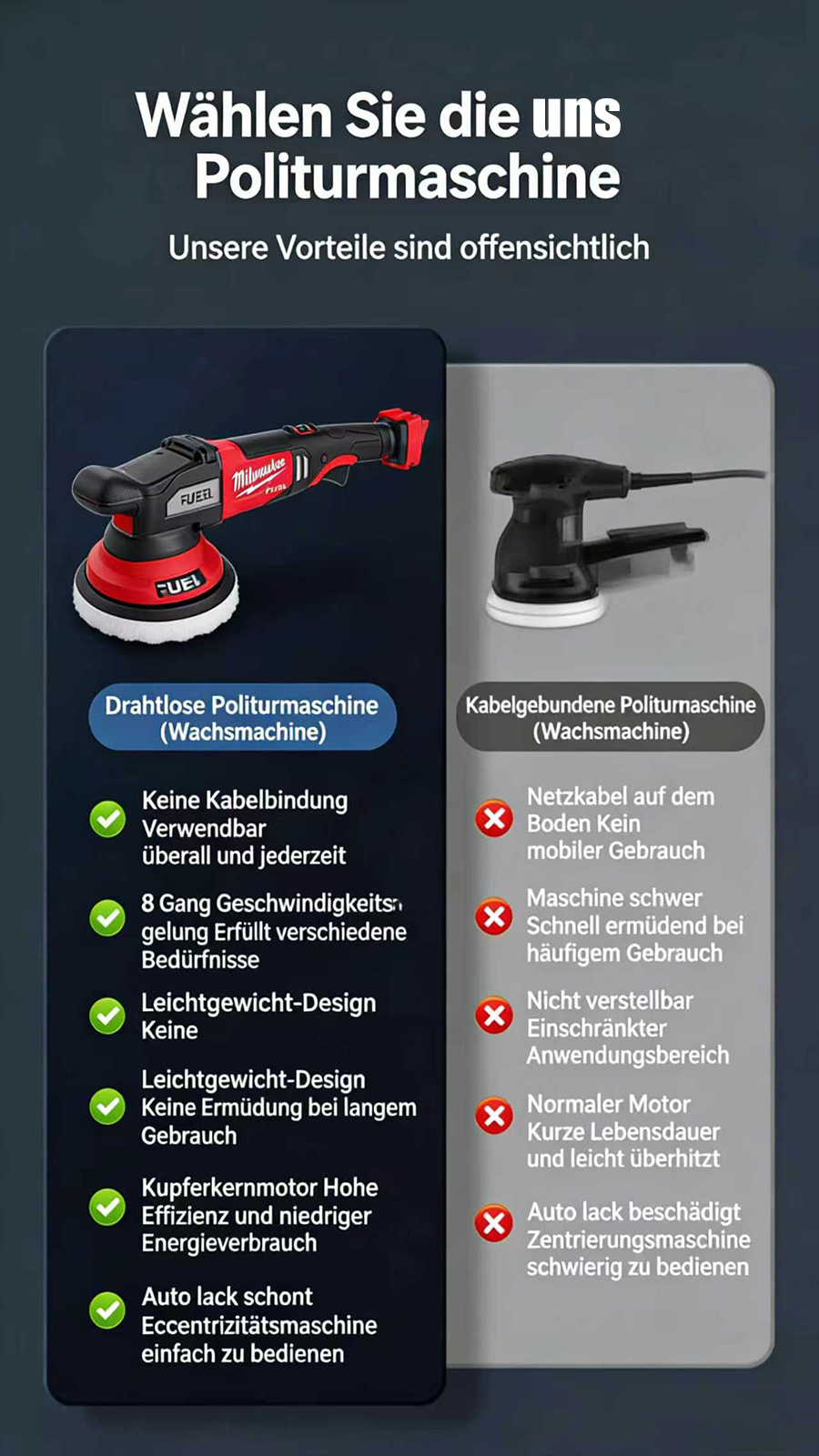 8-stufig einstellbarer, stabiler Motor, eine professionelle Wahl, einfach zu montieren.Kabelloser Polierer: Befreien Sie sich von den Einschränkungen von Kabeln, reparieren Sie Kratzer gründlich und polieren Sie fein in einem Schritt.